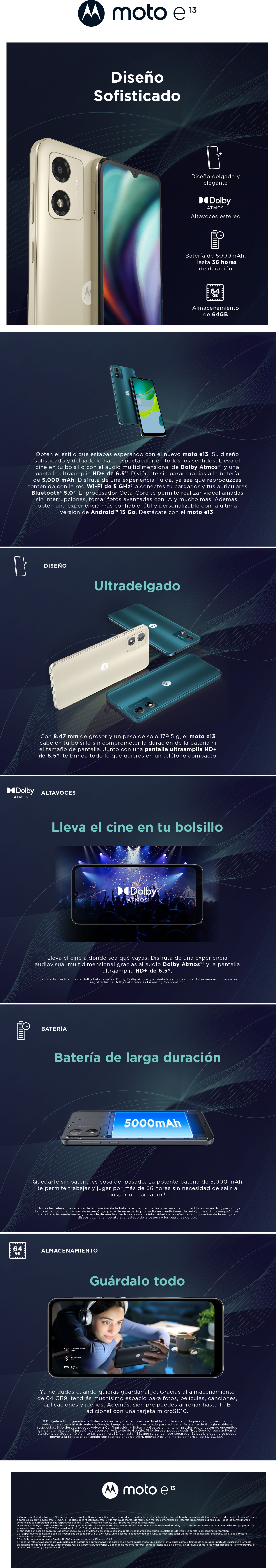 Motorola E13 2+64GB Disponible S/ 329.00 Stock por sucursal Stock por sucursal cantidad Agregar al carro Avísame cuando llegue Características PrincipalesPantalla: LCD 6,52" HD+Procesador: Unisoc Tiger T606Cámara Posterior: 13 MpxBatería: 5,000mAh