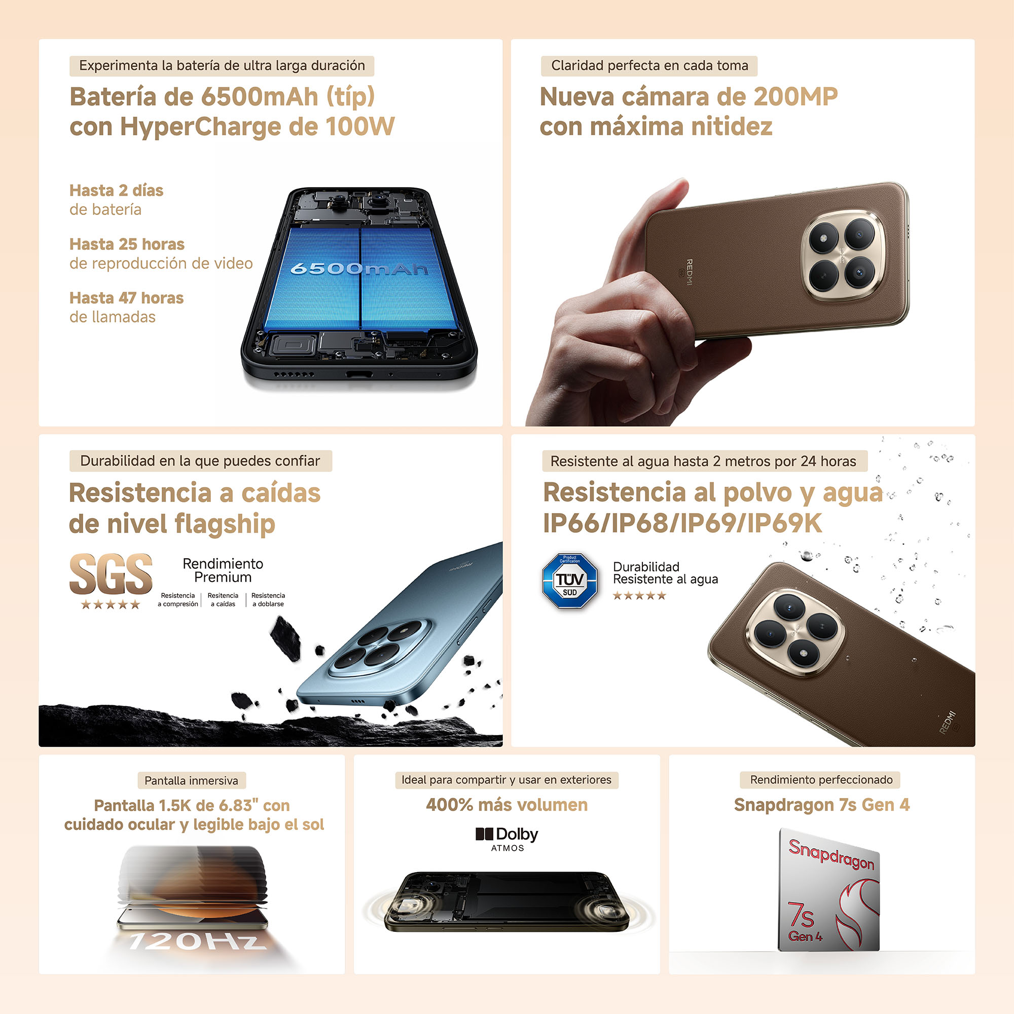 Redmi Note 15 Pro+ 5G 12+512GB Disponible S/ 1, 899.00 Stock por sucursal Stock por sucursal cantidad Agregar al carro Avísame cuando llegue Características PrincipalesPantalla: AMOLED 6,83" 1.5K, 120HzProcesador: Qualcomm Snapdragon 7s Gen4Cámara Posterior: 200MpxCámara Frontal: 32MpxBatería: 6,500mAh