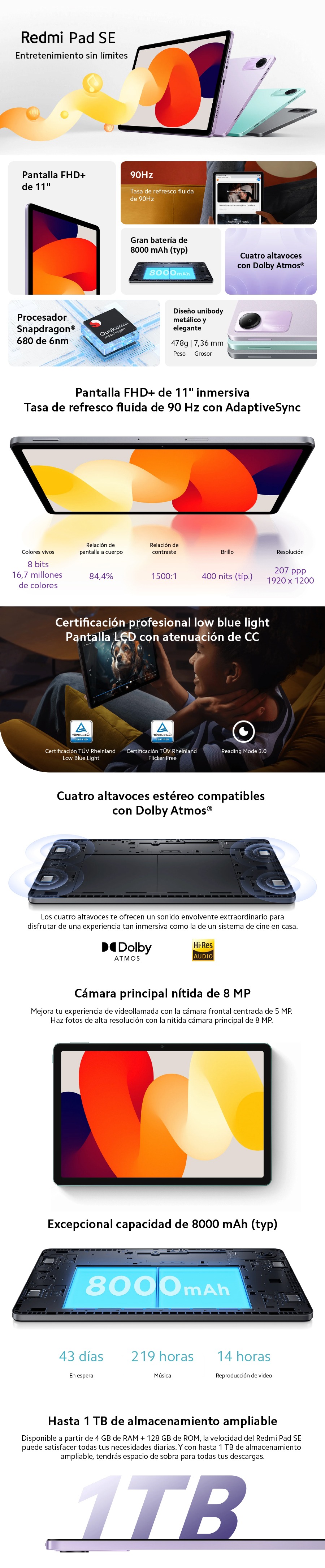 Redmi Pad SE 4+128GB Tablet S/ 629.00 Stock por sucursal Stock por sucursal cantidad Agregar al carro Avísame cuando llegue Características PrincipalesPantalla: FHD+ 11" Pulgadas, 90HzProcesador: Qualcomm Snapdragon 680Cámara: 8 MpxBatería: 8,000mAh