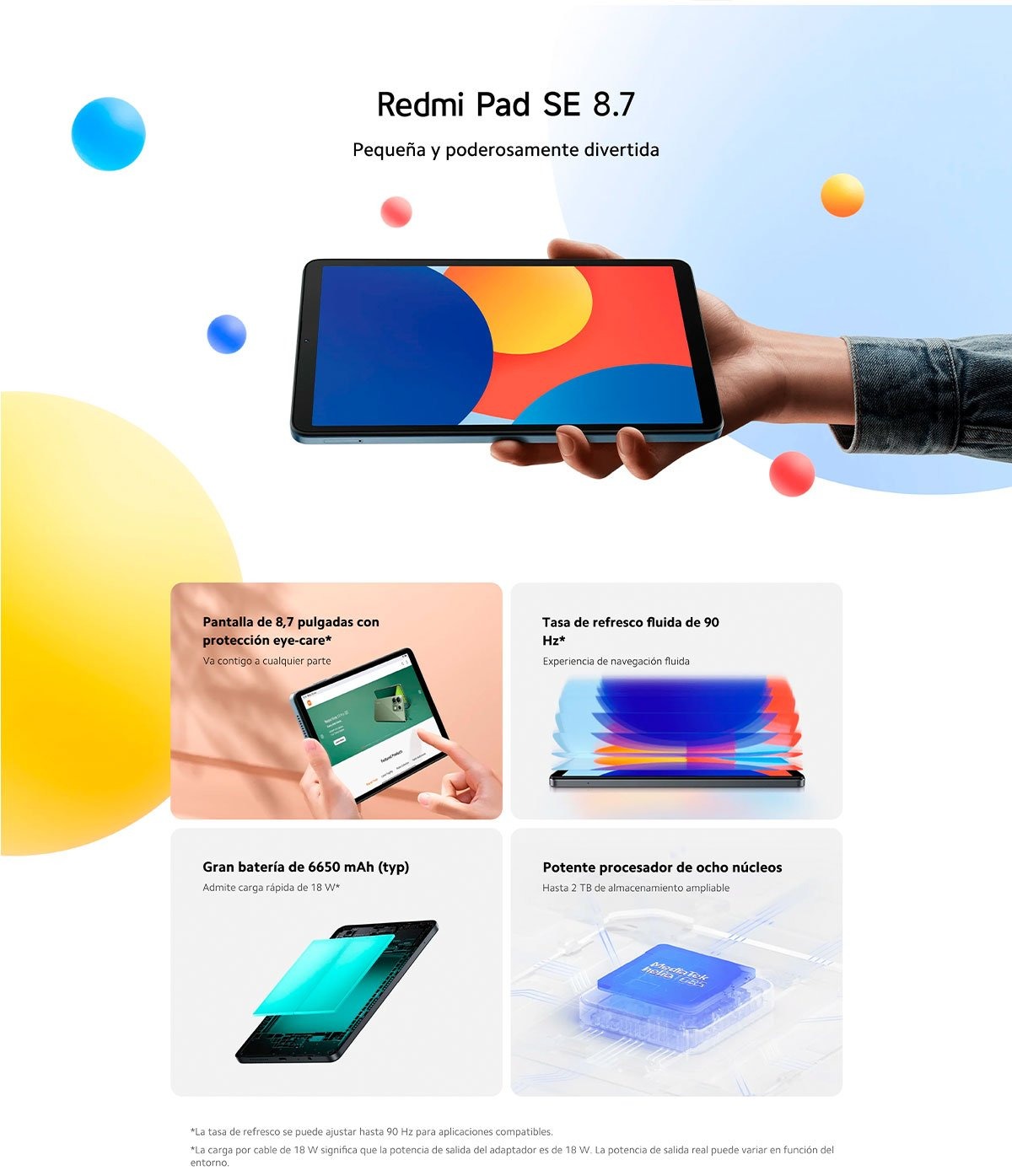 Redmi Pad Se 8.7 (4+64GB) Nuevo Ingreso S/ 349.00 Stock por sucursal Stock por sucursal cantidad Agregar al carro Avísame cuando llegue Características PrincipalesPantalla: LCD 8.7" Pulgadas, 90HzProcesador: MediaTek Helio G85Cámara: 8MpxBatería: 6,650mAh