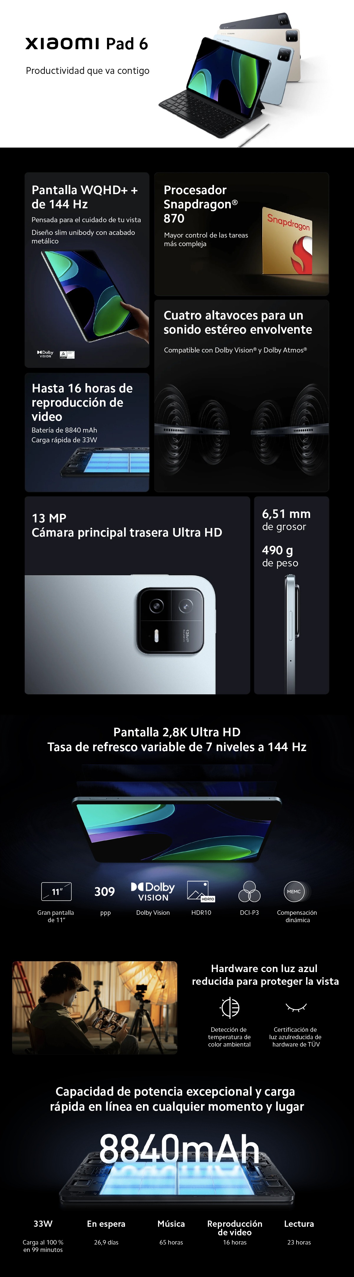 XIAOMI PAD 6 6+128GB Tablet S/ 1, 299.00 Stock por sucursal Stock por sucursal cantidad Agregar al carro Avísame cuando llegue Caracteristicas PrincipalesPantalla: LCD 11" WQHD+Procesador: Qualcomm Snapdragon 870Cámara posterior: 13 MpxBateria: 8,840 mAh